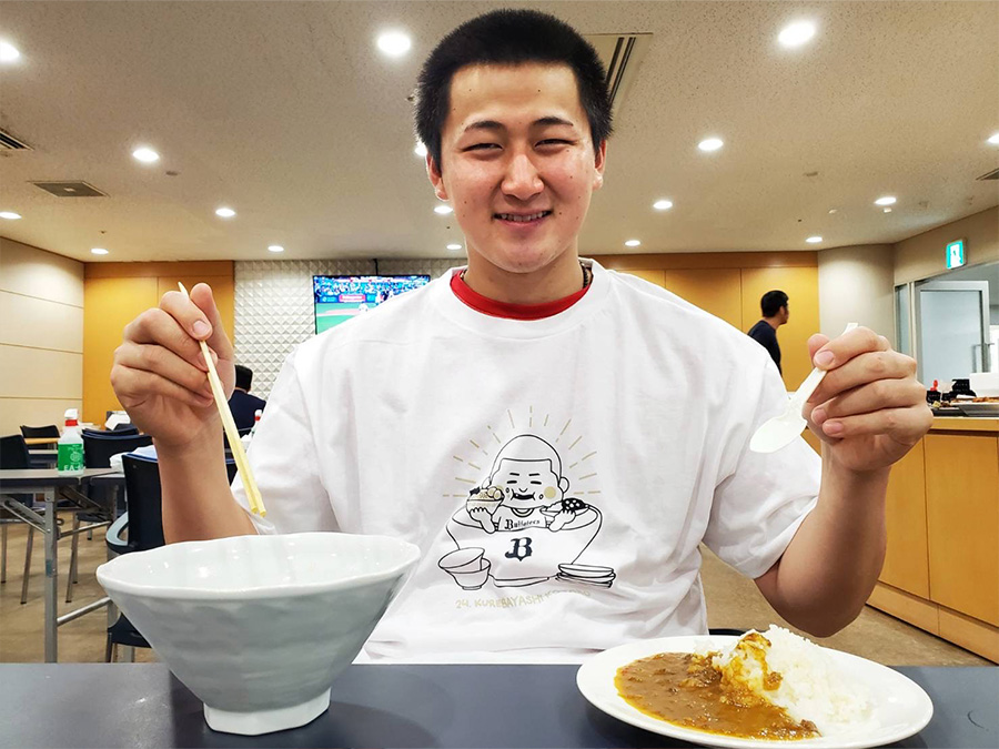 「大食漢と聞いていたので」。紅林弘太郎選手の『もぐもぐシリーズ』デザインに粟屋の迷いはなかった。仁藤が撮影するタイミングでも紅林選手はカレーとラーメン両方を食べていたため、イラストと全く同じシチュエーションを写真に収めることができた。