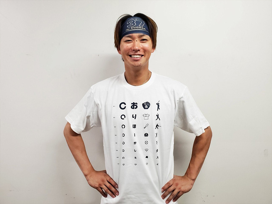 単発で販売するのは唐突感があって難しいが、色とりどりのBシャツの中に入れると魅力がより引き立つ。「宗選手と石川選手みたいに視力検査ポーズで写真を撮ってお楽しみいただけるとうれしいです」と期待を込める。