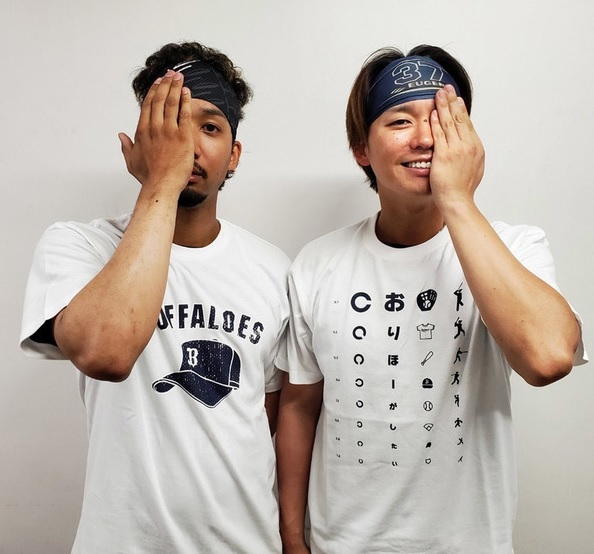 最後に、粟屋「イチオシ」のBシャツをご紹介。石川亮選手がノリノリで着用したという『視力検査表?Tシャツ』だ。個性的な1枚に粟屋は「これぞBシャツ祭り! 遊び心満載です」と熱を込める。「おりほーがしたい」の文字はもちろん、帽子やシャツの小さなイラストにもバファローズロゴを仕込むなど、細部にわたってこだわった。