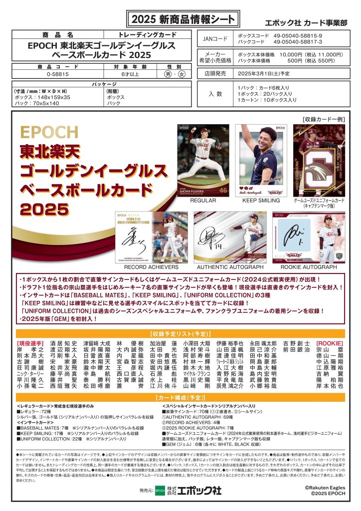 EPOCH 東北楽天ゴールデンイーグルス ベースボールカード 2025