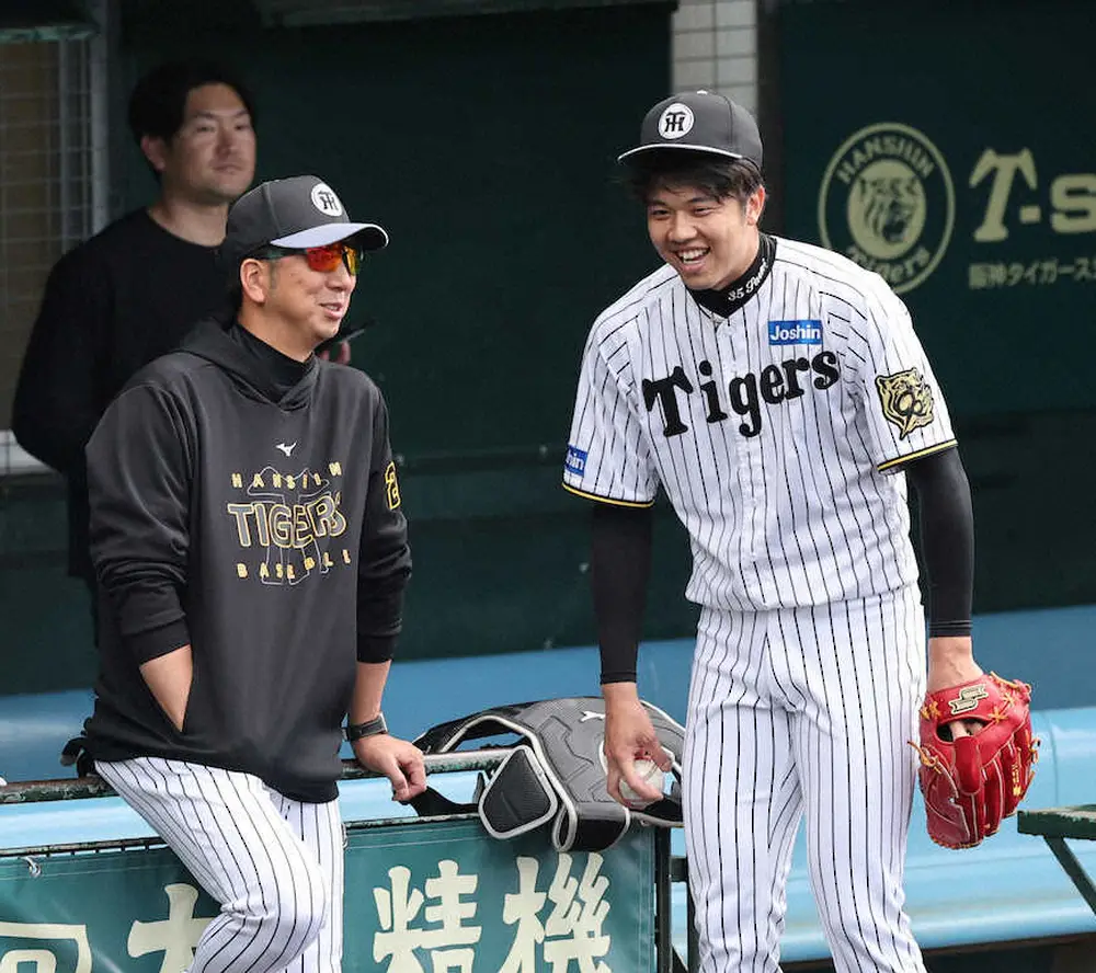 阪神・才木(右)と談笑する藤川監督