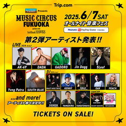株式会社TryHard Japan(大阪市中央区)は、2025年6月7日(土)にみずほPayPayドーム福岡で開催されるオールナイト音楽フェス「STONE MARKET Presents MUSIC CIRCUS FUKUOKA partner with SoftBank HAWKS」の第2弾出演アーティストを発表いたします。