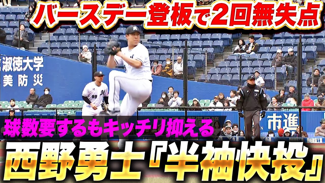 今日が誕生日の千葉ロッテ・西野勇士がバースデー登板。力強いストレートに加え変化球も上々。2回35球を投げ、3奪三振、無失点。開幕へ向け、不安なし。