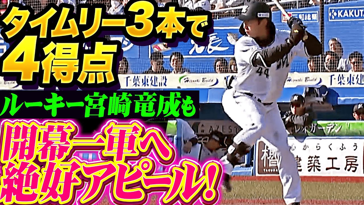 千葉ロッテは3点ビハインドの6回、先頭・ソトのヒットからチャンスを作り、ポランコと岡大海のタイムリーで1点差に迫る。なおもチャンスが続いた場面で、打席には開幕一軍とレギュラー奪取を狙うドラフト2位の宮崎竜成。初球を捉えた鋭い打球はライト線フェアゾーンで弾み、2者が生還!! 3本のタイムリーで試合を一気にひっくり返した!!