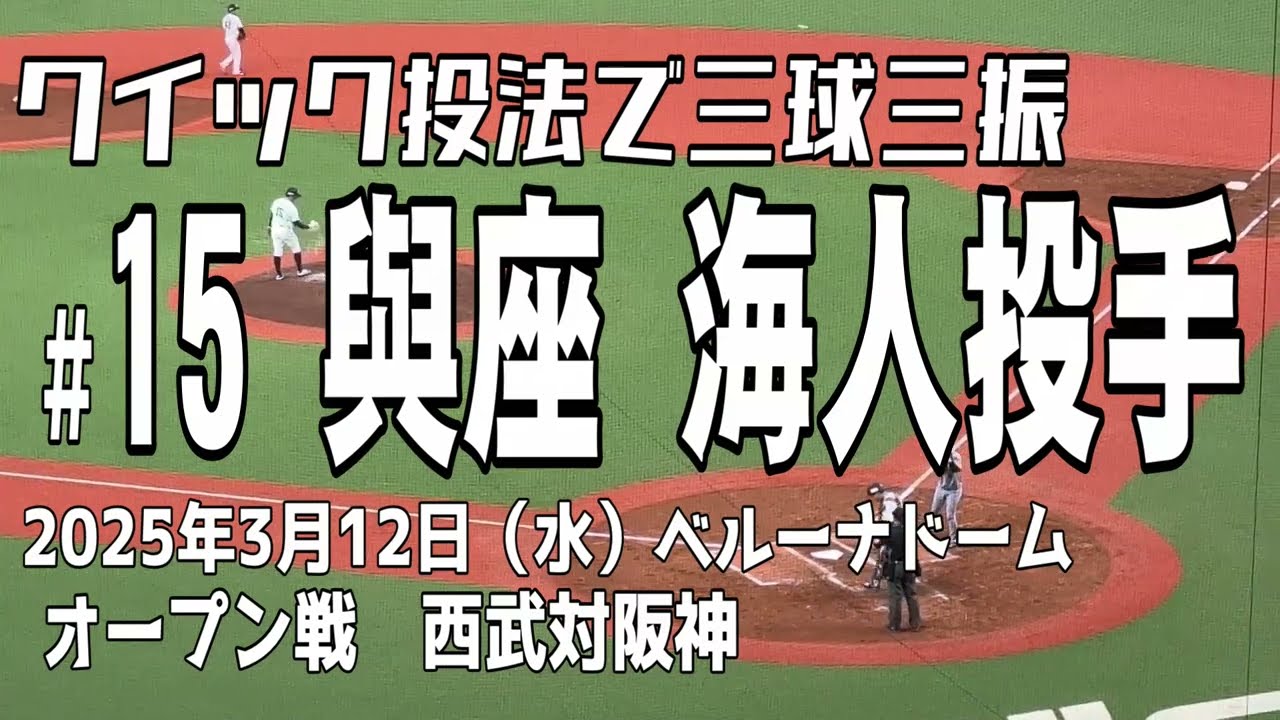 【クイック投法で三球三振】與座海人投手 埼玉西武ライオンズ 2025年3月12日(水)ベルーナドーム オープン戦 西武対阪神 8回表 阪神の攻撃 0アウトランナーなし 9番中野拓夢選手 與座投手の1球目 ど真ん中ストレート131km/h カウント0-1 2球目 内角やや低めスライダー119km/h カウント0-2 3球目 外角低めツーシーム128km/h 球審は市川審判員 Saitama Seibu Lions埼玉西武ライオンズ與座海人 NPBHUB.COM | The Fanbase of Nippon Baseball & Nippon Professional Baseball