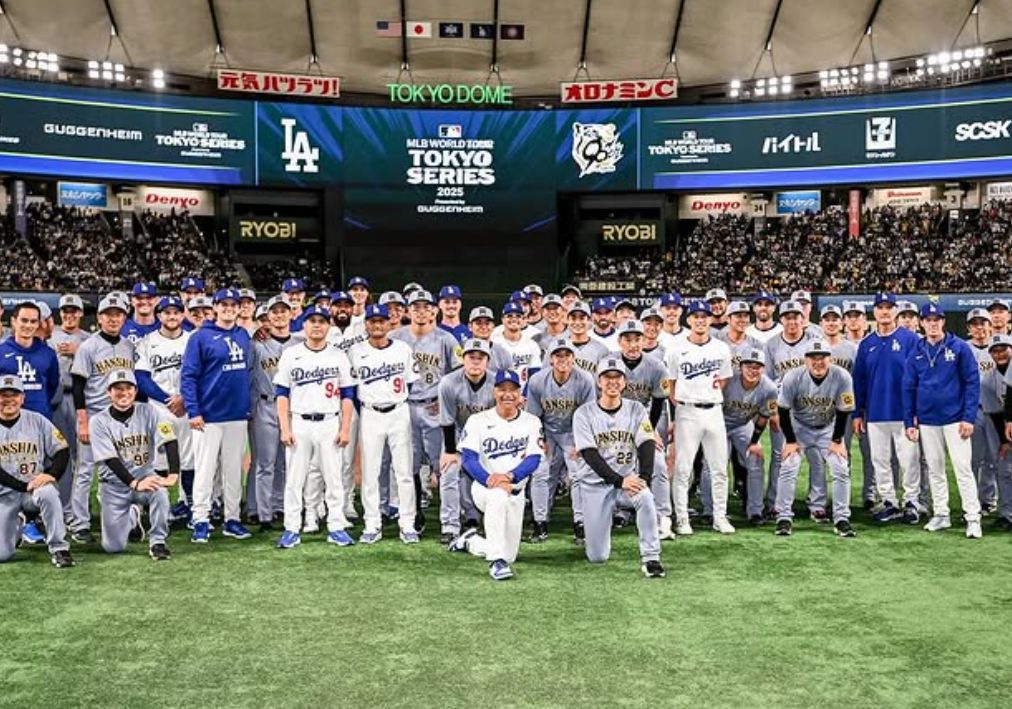 ドジャースと阪神タイガースの集合写真を公開した。ロバーツ監督、藤川球児監督を中心に、両軍の選手たちが入り混じっている。