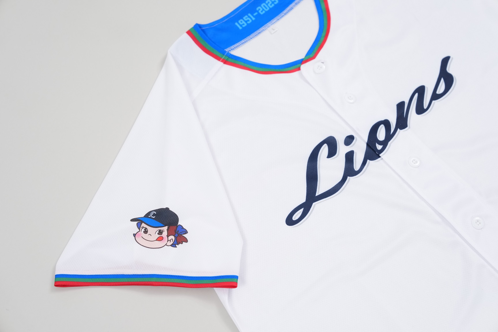 右袖にペコちゃんがデザインされている、ライオンズ75周年ユニフォームを来場者全員(※)に配布します。