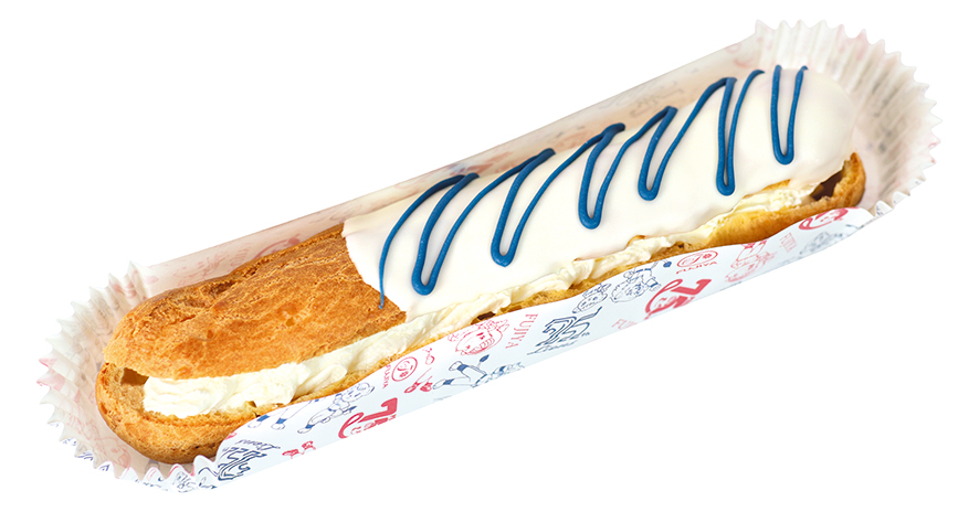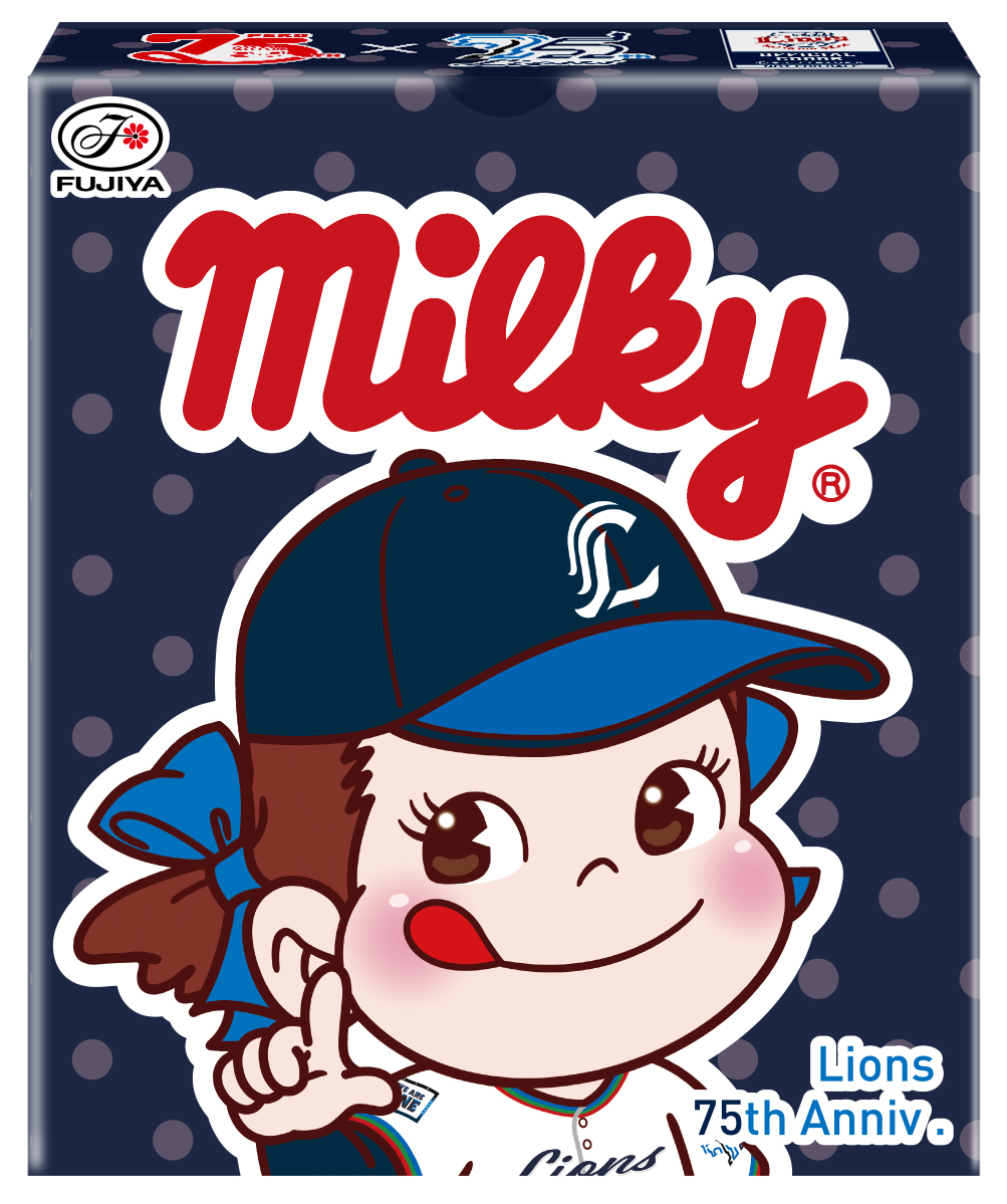 バットに見立てた細長いシュー生地で、ミルキー風味の軽いタイプのカスタードクリームをサンド。上面は白いチョコでコーティングし、埼玉西武ライオンズのイメージカラーの青いチョコの線掛けで仕上げました。敷紙は、埼玉西武ライオンズのユニフォームを着用したペコちゃんとレオやライナ、そしてそれぞれの75周年ロゴを配置した特別なデザインです。