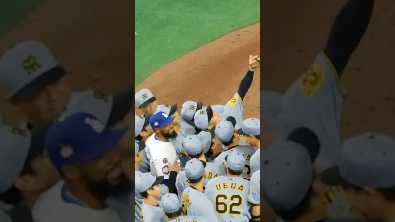 【相手の4番を囲え】テオスカーヘルナンデスを囲って記念撮影する阪神ナイン