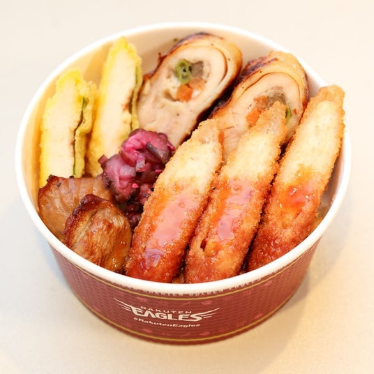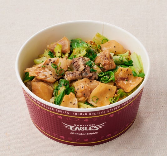 牛たんも乗せ、岡山×仙台を楽しめます。お弁当といえばミートボールと卵焼きという小郷選手のこだわりを付け合わせに添えました。