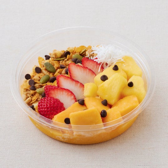 マンゴー&オレンジスムージーをベースに、グラノーラ、マンゴー、パイン、いちご、ココナッツを乗せ、追加でチョコチップをトッピングするのが小郷選手のこだわり!