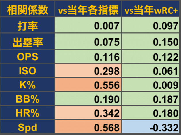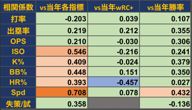 以下の表は、チーム全体のオープン戦における各野手指標と、その年のシーズン成績における各指標、打撃の相対的な総合指標であるwRC+、およびチーム勝率との相関係数を示したものである。なお、 相関係数とは、比較対象との相関を-1から1で表したものであり、0に近づくほど相関がないことを示す。