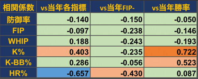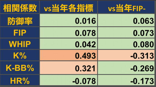 防御率やFIP、WHIPといった指標はいずれも相関がほぼなく、野手における打率やOPSなどと同様に、これらが悪くても気にする必要はなさそうだ。