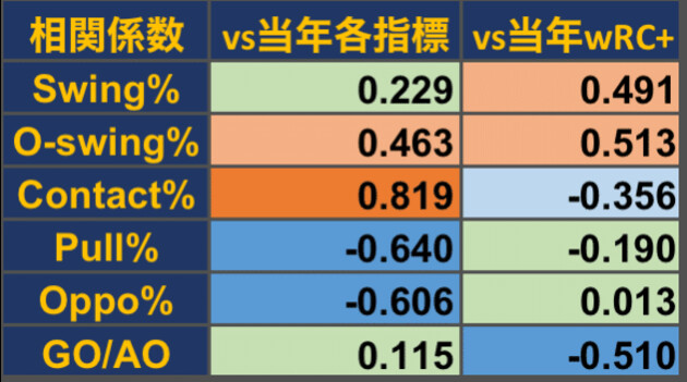 ちなみに、2024年シーズンの8選手のみでサンプル数が少なすぎるため、参考程度に留めておくが、O-swing%(ボール球スイング率)やContact%(コンタクト率)は強い相関が見られ、前述のアプローチ傾向が変わらないことの裏付けとなっている。