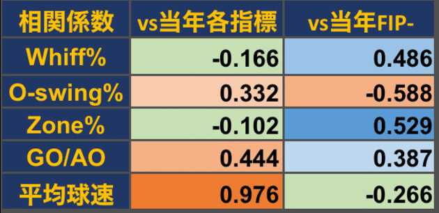 同様にオープン戦における各投手指標と、その年のシーズン成績における各指標、FIP-の相関係数を示したのが、下表である。