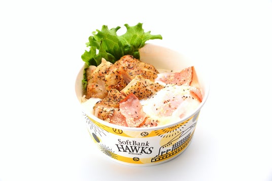 また、選手グルメからは「周東選手のカルボナーラ丼」と「近藤選手の安納芋プリンパフェ」をご紹介。「周東選手のカルボナーラ丼」は、ピラフの上にカルボナーラソースをたっぷりかけ、そのうえにドーン!とスパイシーなチキンを盛り付けた、大満足なグルメです!