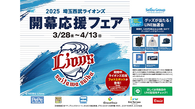 西武鉄道沿線商業施設では、2025シーズンの開幕と共に、3月28日(金)~4月13日(日)の期間、『2025 埼玉西武ライオンズ 開幕応援フェア』を実施します。