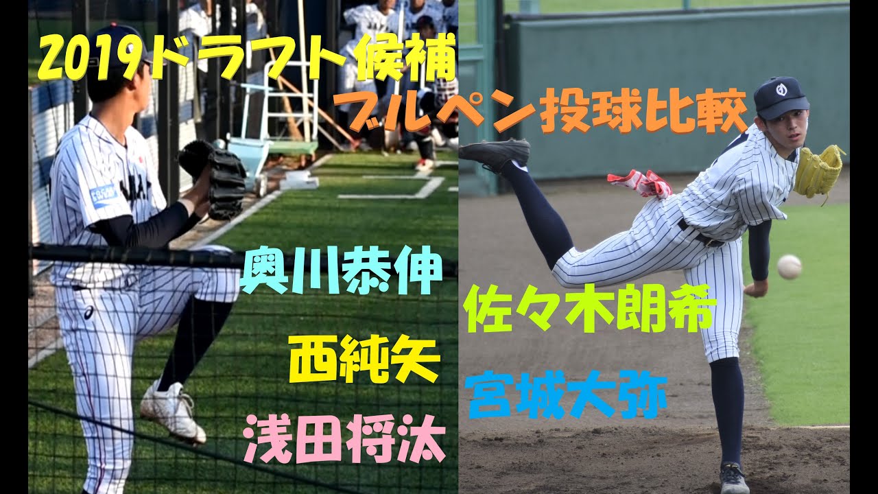 2019ドラフト候補の高校生投手、佐々木朗希(大船渡)、奥川恭伸(星稜)、西純矢(創志学園)、宮城大弥(興南)、浅田将汰(有明)のプルペン投球。