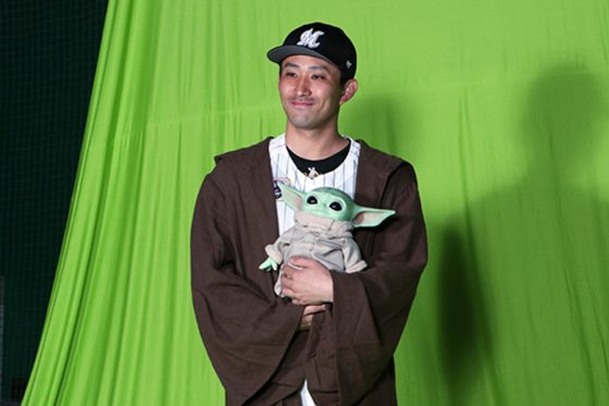 撮影した写真を自身で確認しつつ、最後はフォースの力を秘めた特別な子ども「ベビーヨーダ」こと「グローグー」を抱え、「(イベント当日は)千葉ロッテマリーンズにとって正義になれるように人一倍頑張りますので、みんなもローブを羽織って、ライトセーバーを持って球場に来てください!」と呼びかけた。