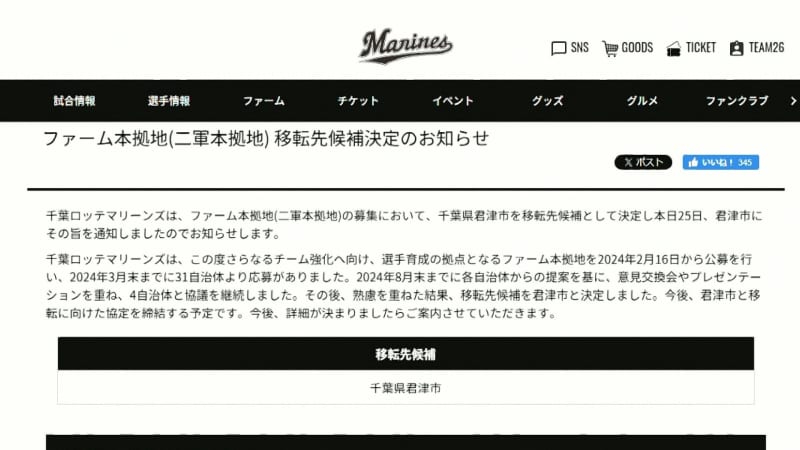 二軍本拠地の移転先を検討していた千葉ロッテマリーンズは3月25日、移転先候補を千葉県君津市に決定したと発表しました。
