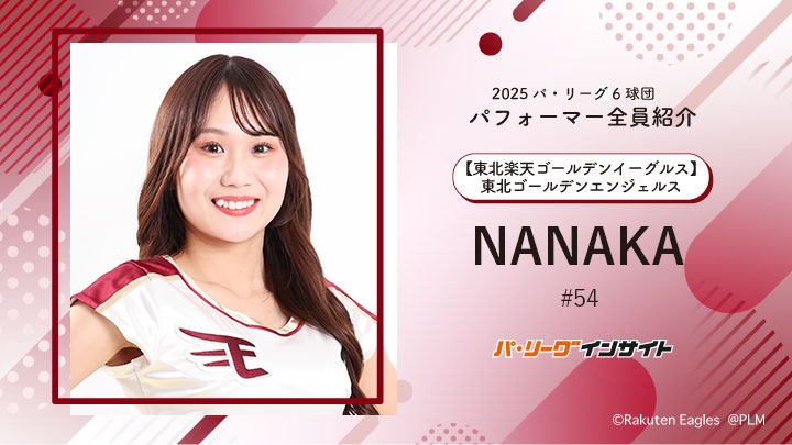 在籍4年目、千葉県出身、11月28日生まれ、趣味は岩盤浴、ショッピング。今季はバイスキャプテンとしてエンジェルスを牽引するNANAKAさん、活動継続の理由について「たくさんの人の原動力になりたい、チアリーダーという職業をより多くの人に知ってもらいたいと思い継続を希望しました。また楽天イーグルスが日本一を掴む景色をエンジェルスとして見たかったからです!」と話します。