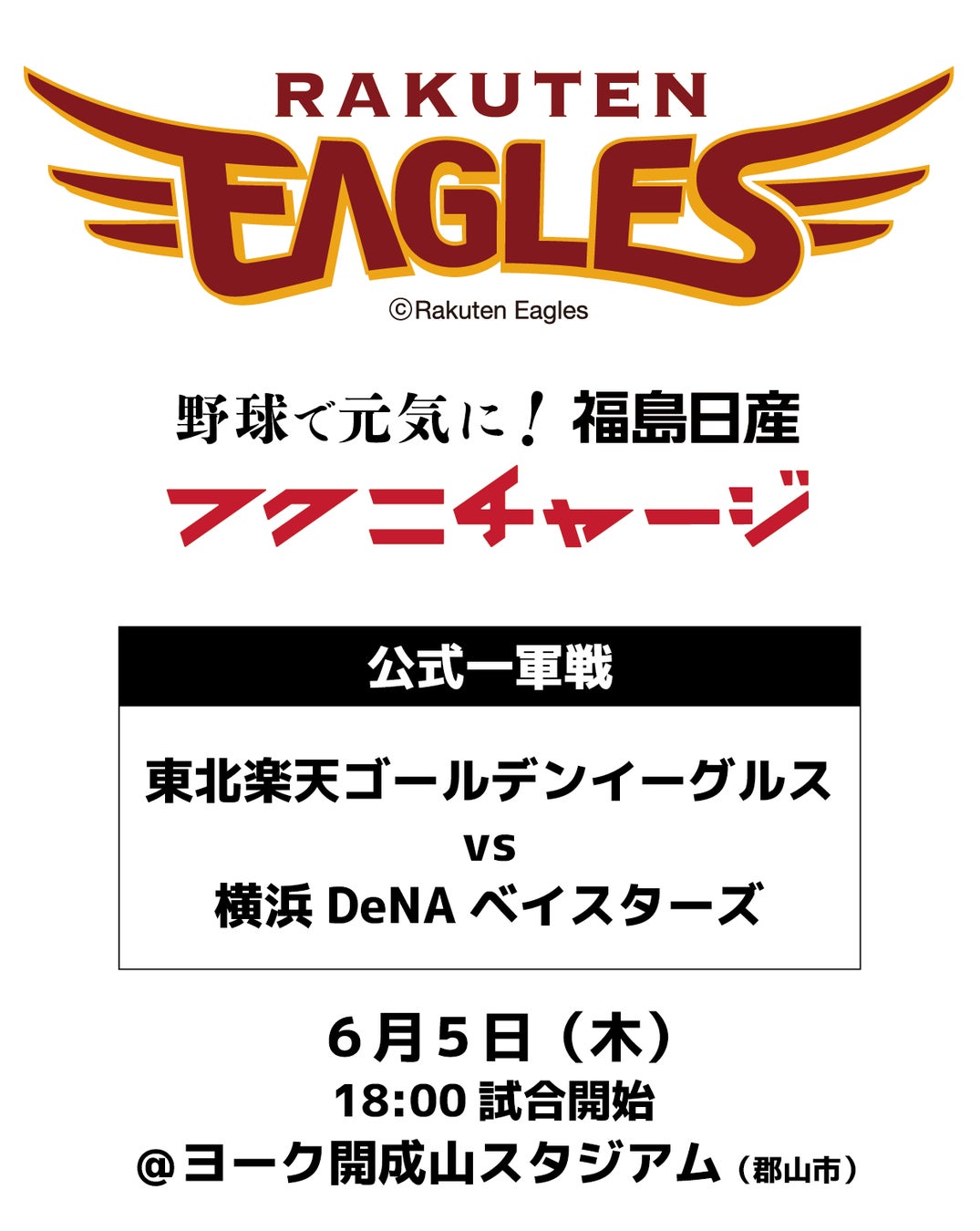 福島日産自動車株式会社(以下福島日産と略、本社:福島県福島市、代表:金子 與志幸)は、2025年6月5日(木)に郡山市のヨーク開成山スタジアムで開催される「福島日産 野球で元気に!フクニチャージ ナイター 日本生命セ・パ交流戦 2025 東北楽天ゴールデンイーグルス(以下楽天イーグルス)vs.横浜DeNAベイスターズ」への冠協賛を行います。