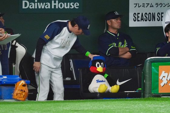 つば九郎人形は三塁側の前列ベンチに置かれており、グラウンドを“見守って”いた。5回に赤羽由紘内野手が先制打を放つと、高津臣吾監督がそっと頭を撫でている姿もあった。