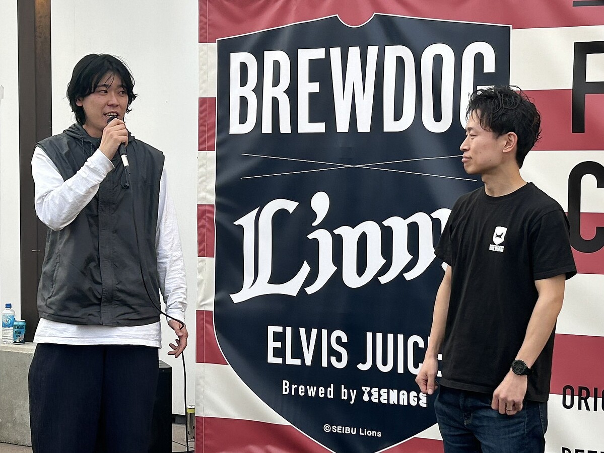 「Lions ELVIS」の発表会に出演したのはブリュードッグ・カンパニー・ジャパンの岡田卓也さんと、クラフトビール醸造所のTeenage Brewingのogawaの小川さん。小川さんは「試合を見ながら飲むビールなので、どんなシーンでも飽きのこない味にとこだわりました」と話します。グラスに注ぐとより香りが引き立ちやすいビールだということで、ぜひ球場で楽しんでもらいたいということです。