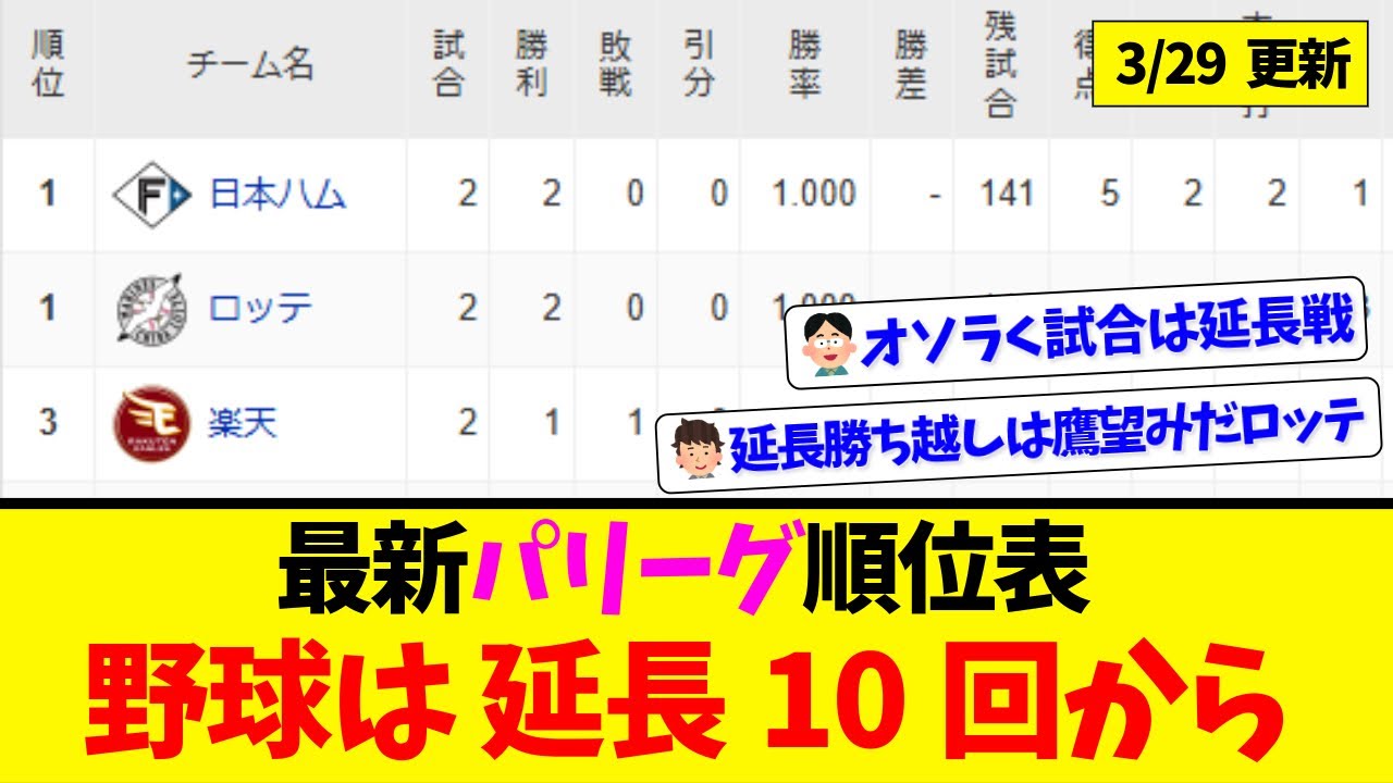 【3月29日】最新パリーグ順位表 ~野球は延長10回から~ ◆WBC映画『憧れを超えた侍たち 世界一への記録』 https://amzn.to/3NxMEJf #パーソルパリーグTV #パシフィックリーグ #プロ野球ニュース #なんJ #ハイライト #福岡ソフトバンクホークス #東北楽天ゴールデンイーグルス #オリックスバファローズ #埼玉西武ライオンズ #北海道日本ハムファイターズ #千葉ロッテマリーンズ #5ch #なんJ #2ch #まとめ #2ch反応 2ch2ch反応5chbaseballBaseball newsオリックスセ・リーグソフトバンクなんGなんJなんJベースボールchなんJ野球王パ・リーグプロ野球ニュースプロ野球報道すてぇしょんベースボールまとめメジャーリーグやきゅうようこそ野球さん千葉ロッテマリーンズ大谷翔平巨人日本ハムファイターズ楽天イーグルス西武ライオンズ野球野球ボール阪神タイガース NPBHUB.COM | The Fanbase of Nippon Baseball & Nippon Professional Baseball