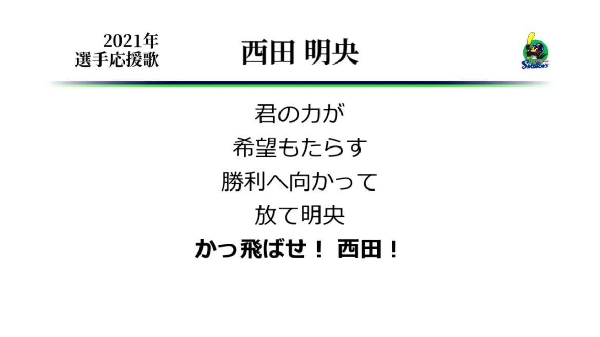 ヤクルト西田選手の応援歌です。 ’21はヤクルトが日本一の歓喜に沸く中で、 西田としては中村に水を開けられる苦しいシーズンに。 ベテラン嶋や成長株古賀の存在もあり、一層の奮起が求められます。 Akihisa Nishida (Baseball Player)Tokyo Yakult SwallowsTokyo Yakult Swallows (Baseball Team)なんぶふじ応援歌東京ヤクルトスワローズ西田明央 NPBHUB.COM | The Fanbase of Nippon Baseball & Nippon Professional Baseball