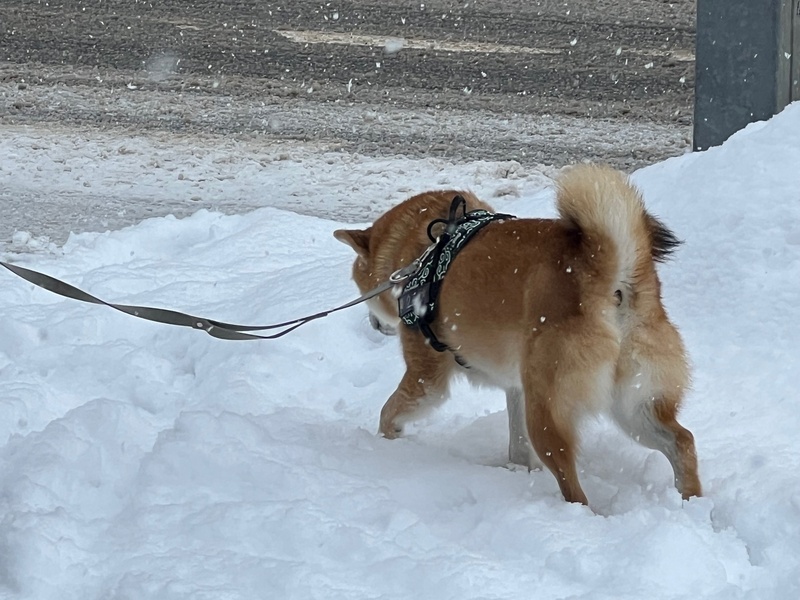 東札幌あたりではもう、もっさりとした雪の中。道路の向こうに柴犬が楽しそうに歩く。「撮っていいですか~?」と尋ね、飼い主さんから快諾を得た頃には柴犬はもうテクテク前方へ。歩き慣れている。