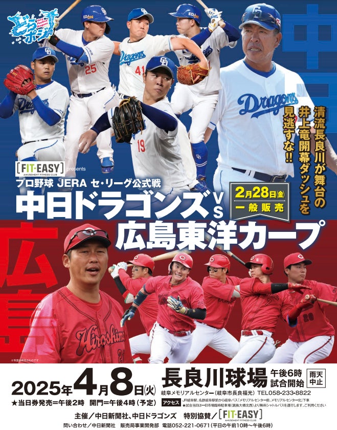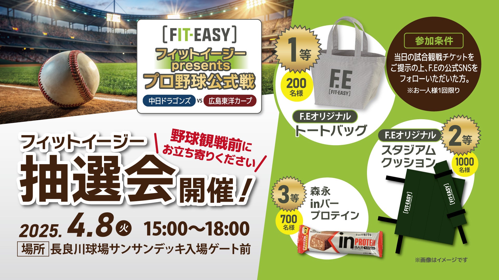 全国でアミューズメントフィットネスクラブを運営するフィットイージー株式会社(本社:岐阜市)は、2025年4月8日(火)に長良川球場で開催される「プロ野球 JERA セ・リーグ公式戦 中日ドラゴンズ vs 広島東洋カープ」に特別協賛をいたします。