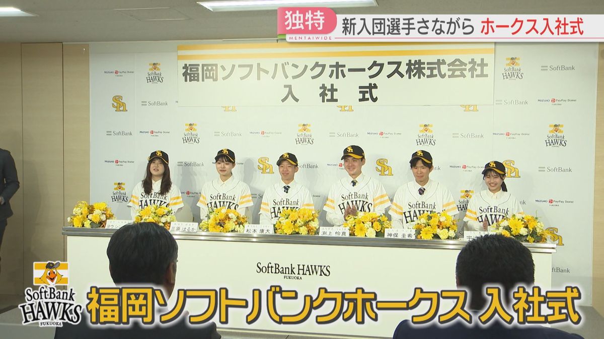 新入社員6人はホークスのユニホームに身を包み、さながら新入団選手のように式に臨みました。
