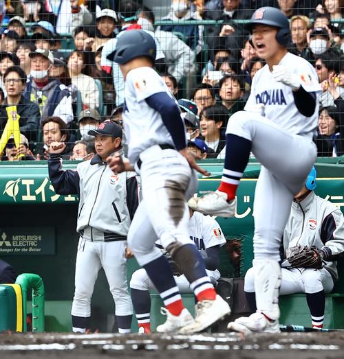 智弁和歌山対横浜 1回裏横浜2死二塁、奥村頼の適時打にガッツポーズをする横浜・村田監督(撮影・上田博志)