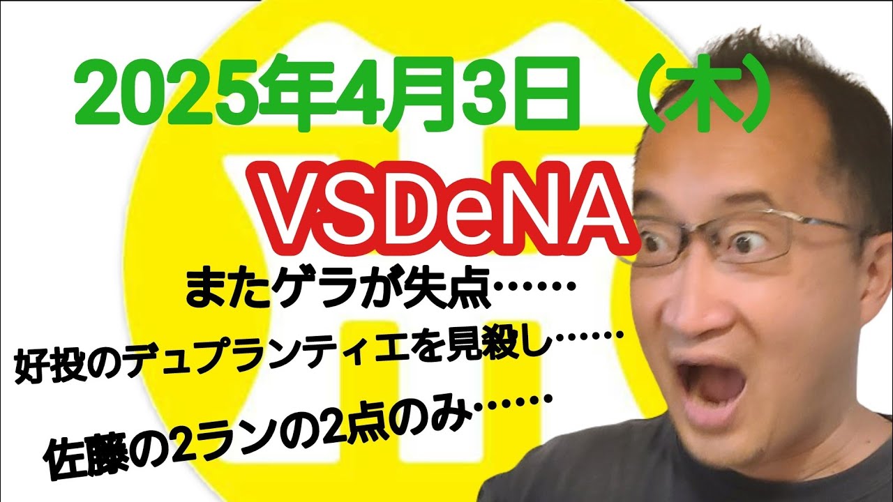 【阪神タイガースについて語る動画】2025年4月3日(木) ● 阪神 2 × 5 DeNA ○ またゲラが失点…… 好投のデュプランティエを見殺し…… 佐藤の2ランの2点のみ……