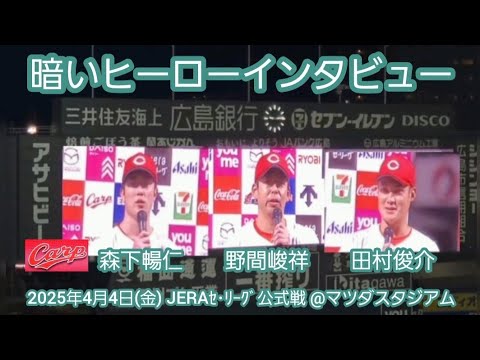 20250404 野間が暗い…【現地】ヒーローインタビュー【森下暢仁、野間峻祥、田村俊介】広島東洋カープ@MAZDA Zoom-Zoom スタジアム広島・ビジターパフォーマンス