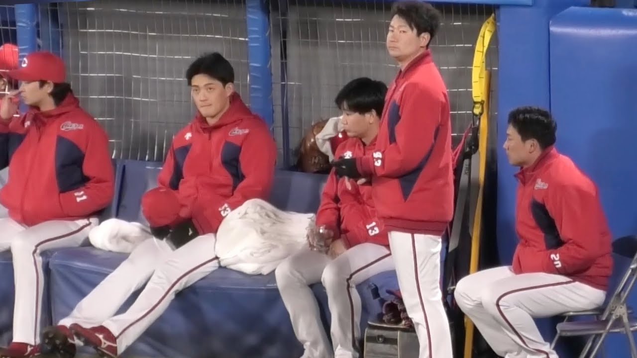 寒さに耐えながら戦況を見守る広島カープのブルペン!島内、栗林、岡本、森浦、スズケン!広島東洋カープvs東京ヤクルトスワローズ 2025年4月3日