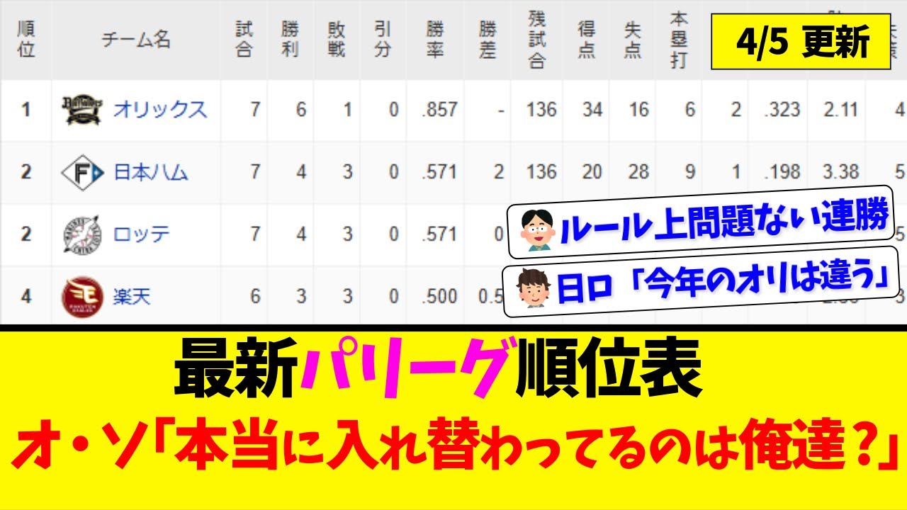 【4月5日】最新パリーグ順位表 ~オ・ソ「本当に入れ替わってるのは俺達?」~ ◆WBC映画『憧れを超えた侍たち 世界一への記録』 https://amzn.to/3NxMEJf #パーソルパリーグTV #パシフィックリーグ #プロ野球ニュース #なんJ #ハイライト #福岡ソフトバンクホークス #東北楽天ゴールデンイーグルス #オリックスバファローズ #埼玉西武ライオンズ #北海道日本ハムファイターズ #千葉ロッテマリーンズ #5ch #なんJ #2ch #まとめ #2ch反応 2ch2ch反応5chORIX Buffaloesオリックスオリックス・バファローズセ・リーグソフトバンクなんGなんJなんJベースボールchなんJ野球王パ・リーグプロ野球ニュースプロ野球報道すてぇしょんまとめメジャーリーグようこそ野球さん千葉ロッテマリーンズ大谷翔平巨人日本ハムファイターズ楽天イーグルス西武ライオンズ野球阪神タイガース NPBHUB.COM | The Fanbase of Nippon Baseball & Nippon Professional Baseball