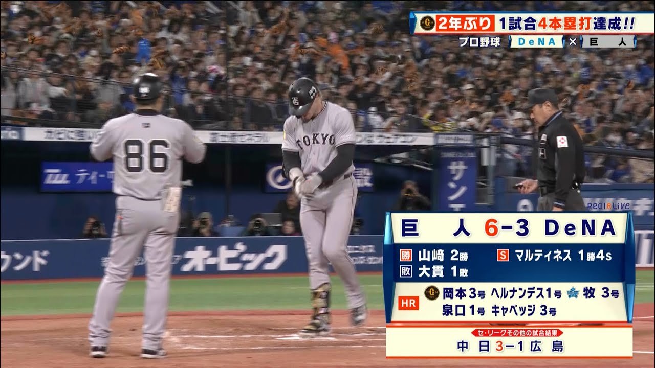 7回には泉口、キャベッジも本塁打を放ち、巨人は2年ぶりに一試合4本塁打を達成。