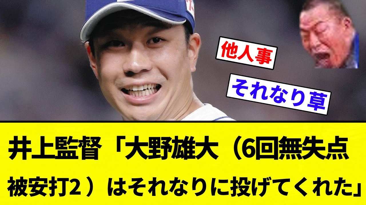 【他人事で草】井上監督「大野雄大(6回無失点 被安打2 与四球0)はそれなりに投げてくれた」【プロ野球反応集】【2chスレ】【なんG】