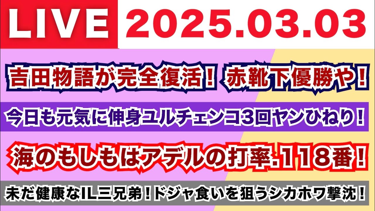 【2025.03.03】吉田物語が完全復活!赤靴下優勝や!/今日も元気に伸身ユルチェンコ3回ヤンひねり!/海のもしもはアデルの打率.118番!/未だ健康なIL三兄弟!ドジャ食いを狙うシカホワ撃沈!