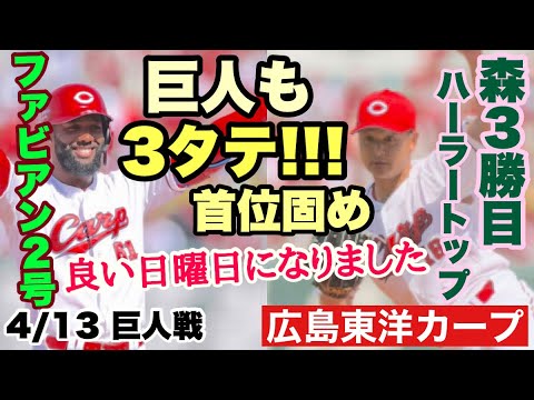 【広島東洋カープ】4/13 巨人戦 週末のマツダは3タテ!!! 巨人も撃破で首位をガッチリキープです 森はハーラートップの3勝目 【森翔平】【サンドロ・ファビアン】【二俣翔一】【新井貴浩】【カープ】