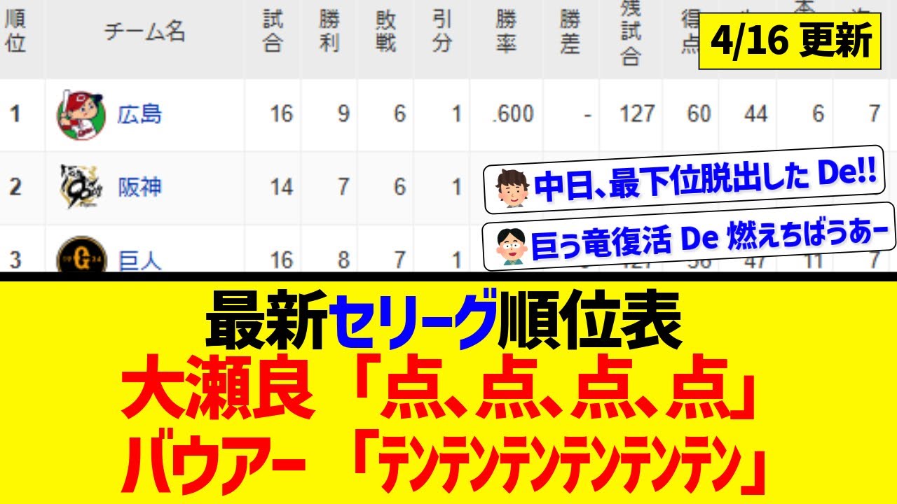 【4月16日】最新セリーグ順位表 ~大瀬良「点、点、点、点」バウアー「テンテンテンテンテンテン」~