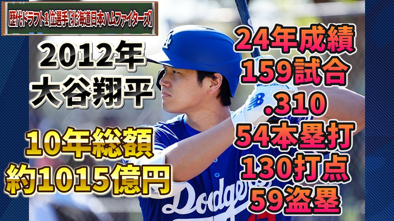 2012年、大谷翔平、24年からドジャース、10年総額、約1015億円、24年成績、159試合、3割1ぶ、54本塁打、130打点、59盗塁