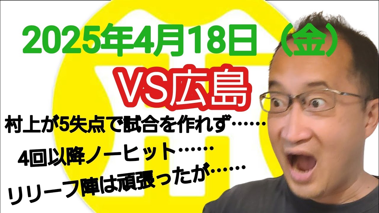 【阪神タイガースについて語る動画】2025年4月18日(金) ● 阪神 2 × 5 広島 ○ 村上が5失点で試合を作れず…… 4回以降ノーヒット…… リリーフ陣は頑張ったが……