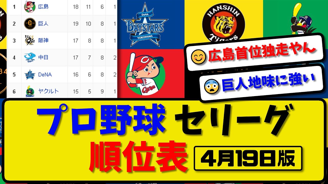 【最新】プロ野球セ・リーグ順位表 4月19日版|中日3-2横浜|阪神0-3広島|ヤク4-6巨人|【まとめ・反応集・なんJ・2ch】 #順位表 #阪神タイガース #読売ジャイアンツ #広島カープ #横浜DeNAベイスターズ #中日ドラゴンズ #ヤクルトスワローズ #プロ野球 #反応集 baseballBaseball newsベースボールやきゅう野球野球ボール NPBHUB.COM | The Fanbase of Nippon Baseball & Nippon Professional Baseball
