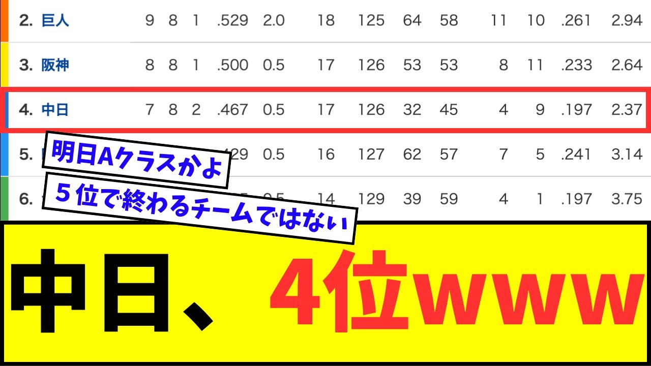 【朗報】中日ドラゴンズ、4位wwwww【なんJ反応】【プロ野球反応集】