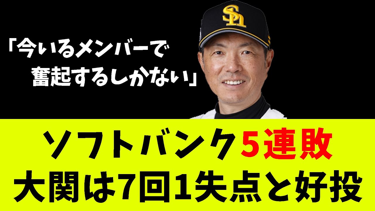 【点が取れない】ソフトバンク5連敗に借金5・大関友久投手は7回1失点と好投も打線沈黙【プロ野球反応集】【5chスレ】【なんj】