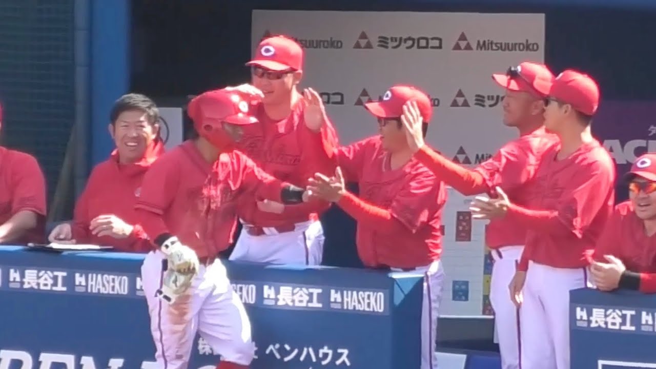 初回1死一、三塁から末包は四球を選んだが、小園がスタートを切り、捕手の松尾が二塁送球したことを確認して三走・羽月がスタートしホームスチール成功!