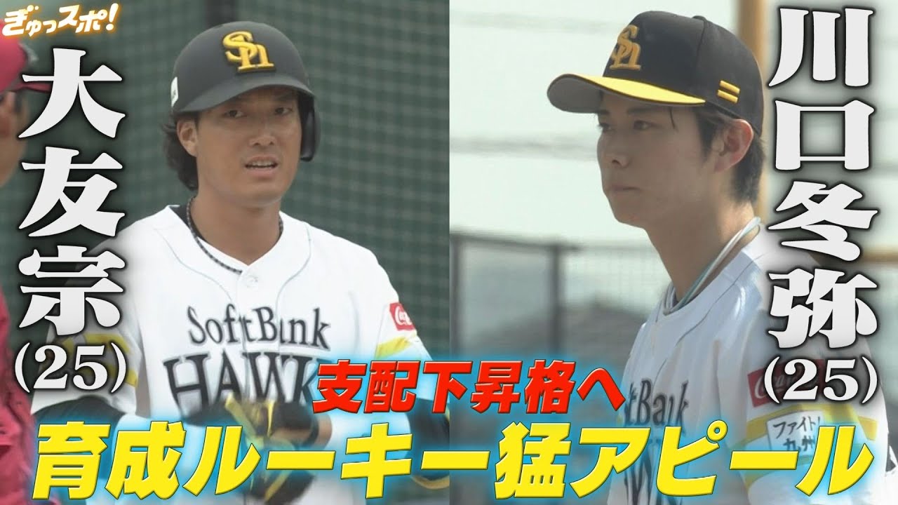 大友宗&川口冬弥 支配下昇格へ猛アピールする育成ルーキー【ぎゅっスポ!ホークスこぼれ話】 “2025年4月25日放送。 支配下昇格へ、タマスタ筑後で猛アピールする育成ルーキーに注目。 端正なルックスで話題の川口冬弥は、2軍で失点0の完璧投球。 力強い投球に磨きがかかる。 同じく育成捕手の大友宗は、甲斐キャノン級の強肩で衝撃を残す。 目指すのは1軍、オールドルーキーの奮闘は続く。 #福岡ソフトバンクホークス #珍プレー好プレー #パシフィックリーグ #カイラ #シリスポ #ぎゅっスポ!” #プロ野球Fukuoka SoftBank HawksKBCアサデスアスリートシリタカスポーツセ・リーグパ・リーグホークスももスポ九州朝日放送福岡福岡ソフトバンクホークス野球 NPBHUB.COM | The Fanbase of Nippon Baseball & Nippon Professional Baseball